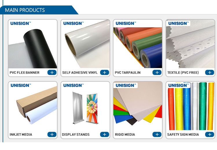 - Unisign's products involve Laminated frontlit and backlit flex, Blockout, Mesh, One way vision, Knife Coated, Perforated Vinyl, Self-Adhesive Vinyl, Textile, Tarpaulin for Truck Covers & tents and so on.